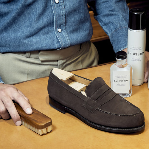 Vous venez d’acquérir une paire de chaussures J.M. Weston, son avenir est entre vos mains. Un entretien régulier permet de préserver la souplesse du cuir et de sublimer son apparence. Voici les trois étapes essentielles pour prendre soin de vos chaussures J.M. Weston en cuir velours à renouveler tous les trois à quatre ports.